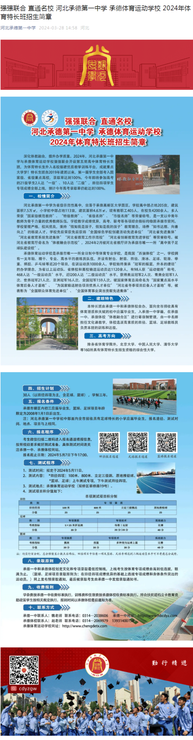 強強聯(lián)合 直通名校 河北承德第一中學(xué) 承德運動體育學(xué)校 2024年體育特長班招生簡章