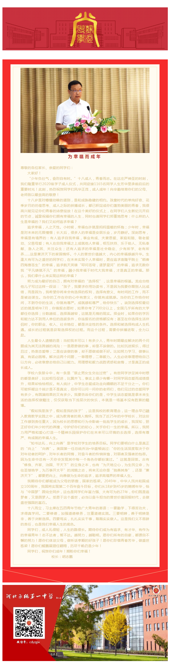胡志鵬校長成人禮致辭 為幸福而成年
