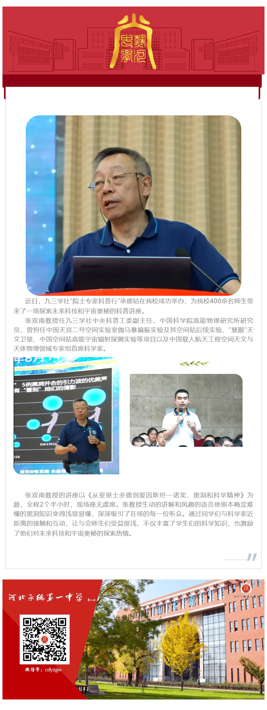 “院士專家科普行”承德站在河北承德第一中學成功舉辦